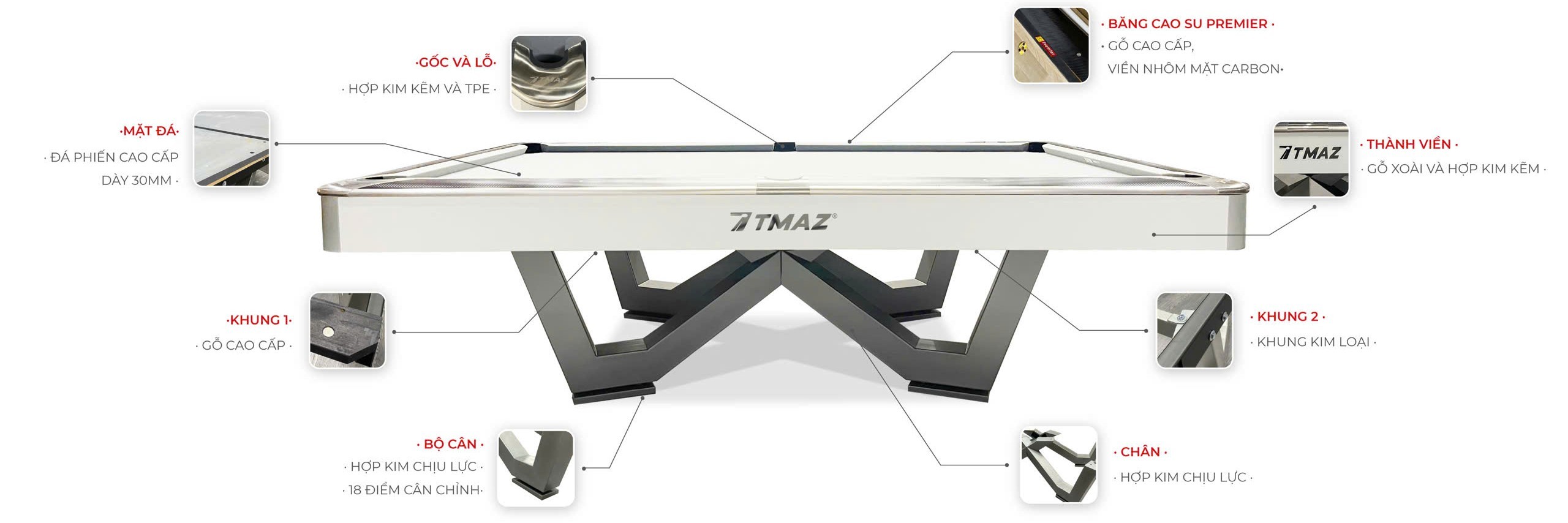 Hoàn mỹ trong từng chi tiết, bàn bi-a TMAZ Billiards kết hợp thiết kế mạnh mẽ, chất liệu cao cấp và độ chính xác tuyệt đối. Chân W hợp kim nhôm vững chắc, mặt băng carbon bền bỉ, băng cao su Premier đàn hồi hoàn hảo – tất cả tạo nên trải nghiệm bi-a chuyên nghiệp đẳng cấp.