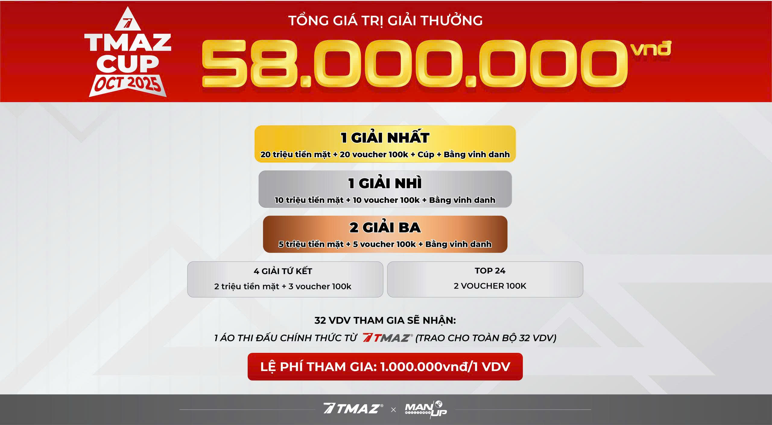 TMAZ CUP OCT 2025 không chỉ là một giải đấu, mà còn là nơi khẳng định đẳng cấp, nơi những cơ thủ tài năng tỏa sáng. Với tổng giá trị giải thưởng hơn 58.000.000 VNĐ, giải đấu mang đến sự kết hợp hoàn hảo giữa giá trị vật chất và vinh quang danh dự, dành riêng cho cộng đồng GIẢI BI-A TMAZ chuyên nghiệp.