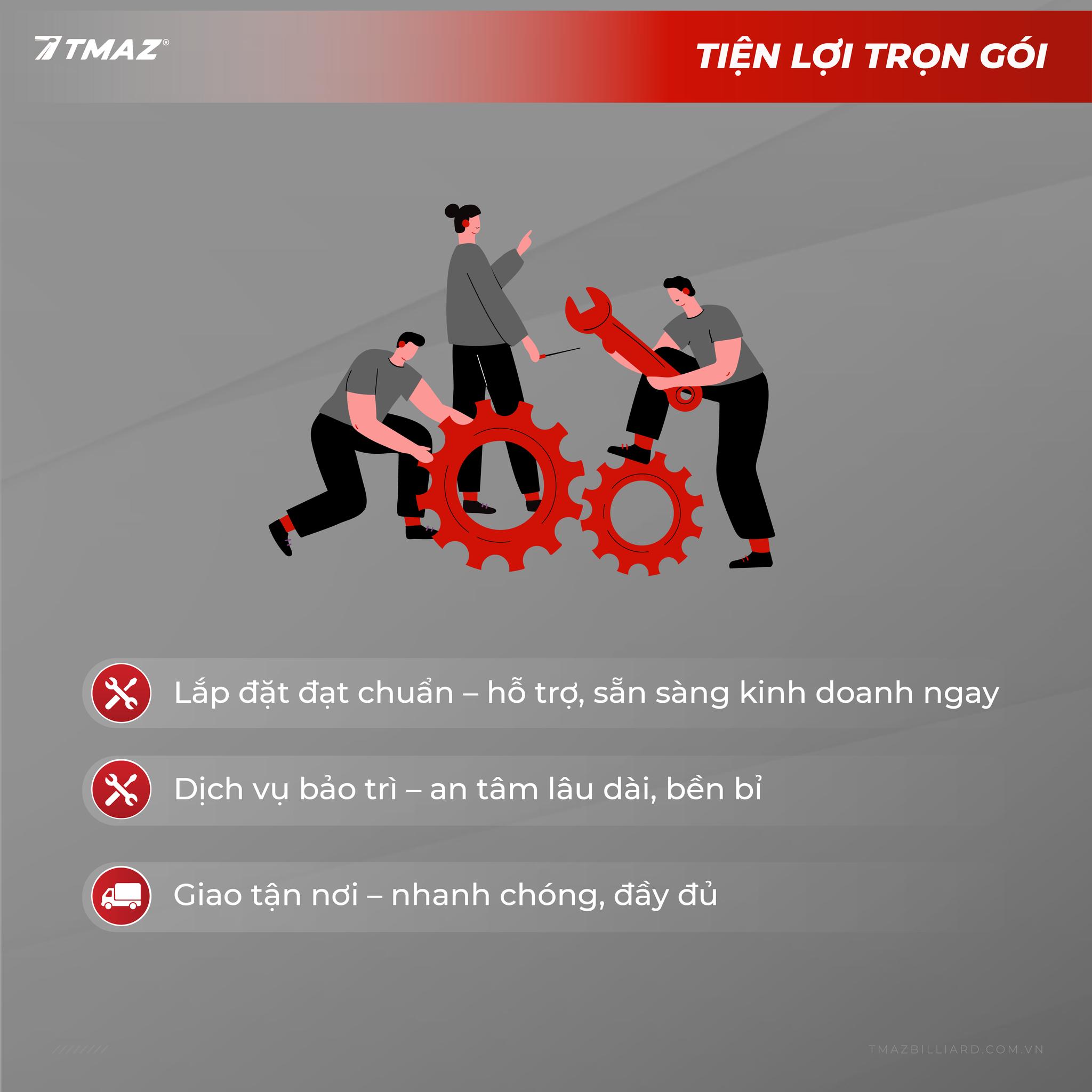 Lợi ích: Khách hàng hoàn toàn yên tâm khi thuê bàn bi-a chuẩn thi đấu, vừa chất lượng vừa chuyên nghiệp.